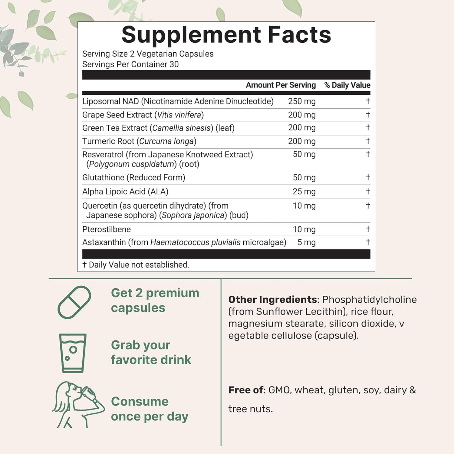 Each bottle contains 60 natural vegetarian capsules, providing Liposomal NAD+ enhanced with Grape Seed Extract, Green Tea Extract, Turmeric Root, Resveratrol, Reduced Glutathione, Alpha Lipoic Acid (ALA), Quercetin, Pterostilbene, and Astaxanthin.