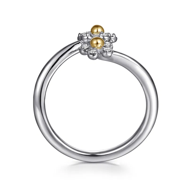 14K Yellow Gold 925 Sterling Silver Diamond Flower Bypass Ring
