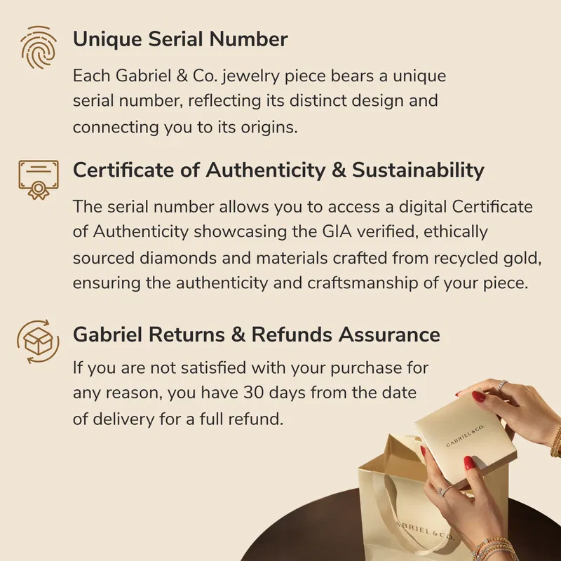 Each Gabriel & Co. jewelry piece bears a unique serial number, reflecting its distinct design and connecting you to its origins.